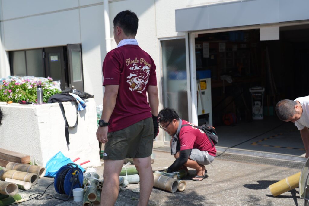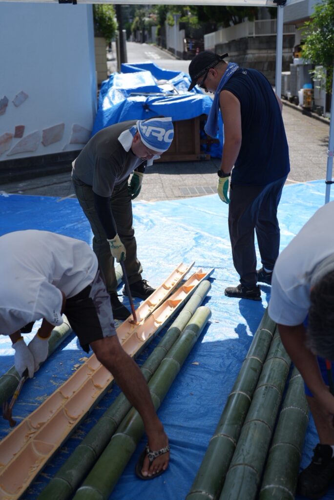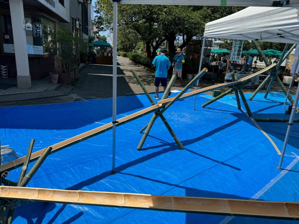 流しそうめんのスライダー部分を支える支柱も、もちろん竹で組み立てます。