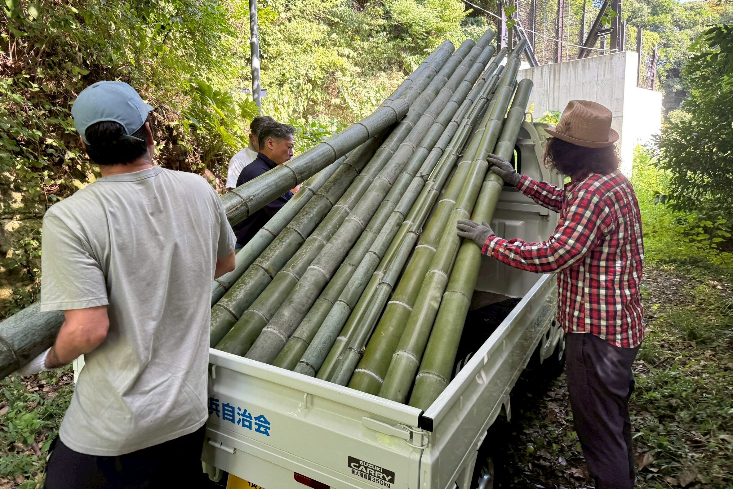まずは稲村ガーデンで竹を切り出して、プロムナードまで運びます。